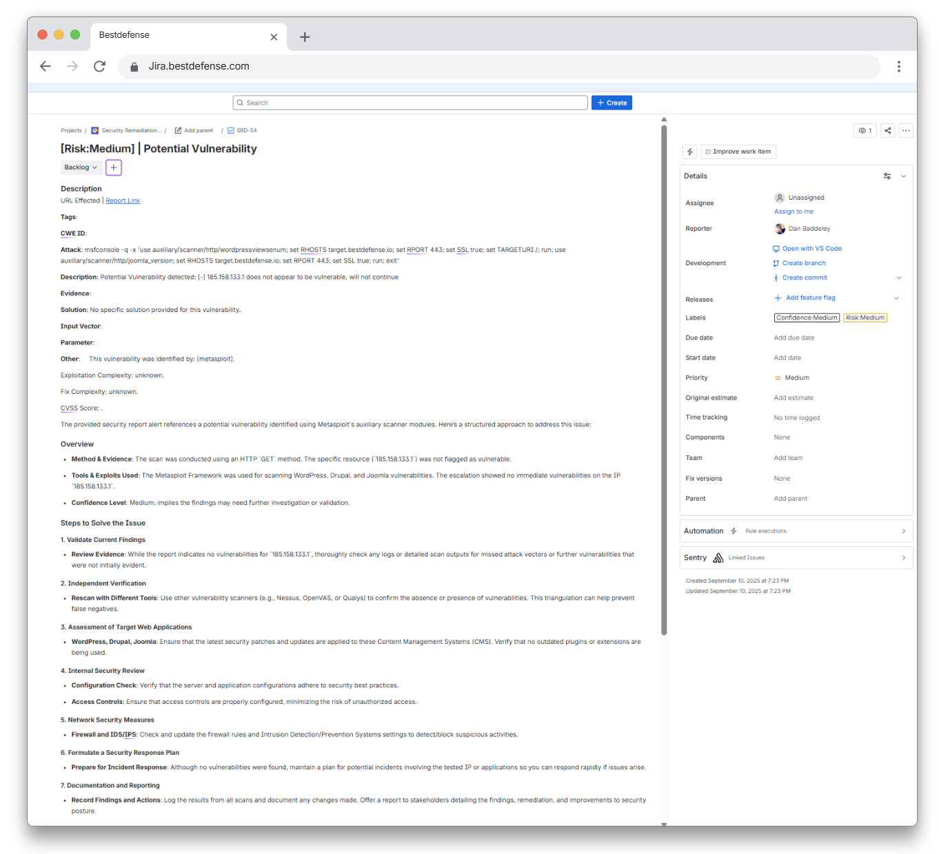 Integrate with your favorite ticket tool like Jira to pass on work. Our AI will not only write the ticket, but it will include guidance on how to fix the right way.